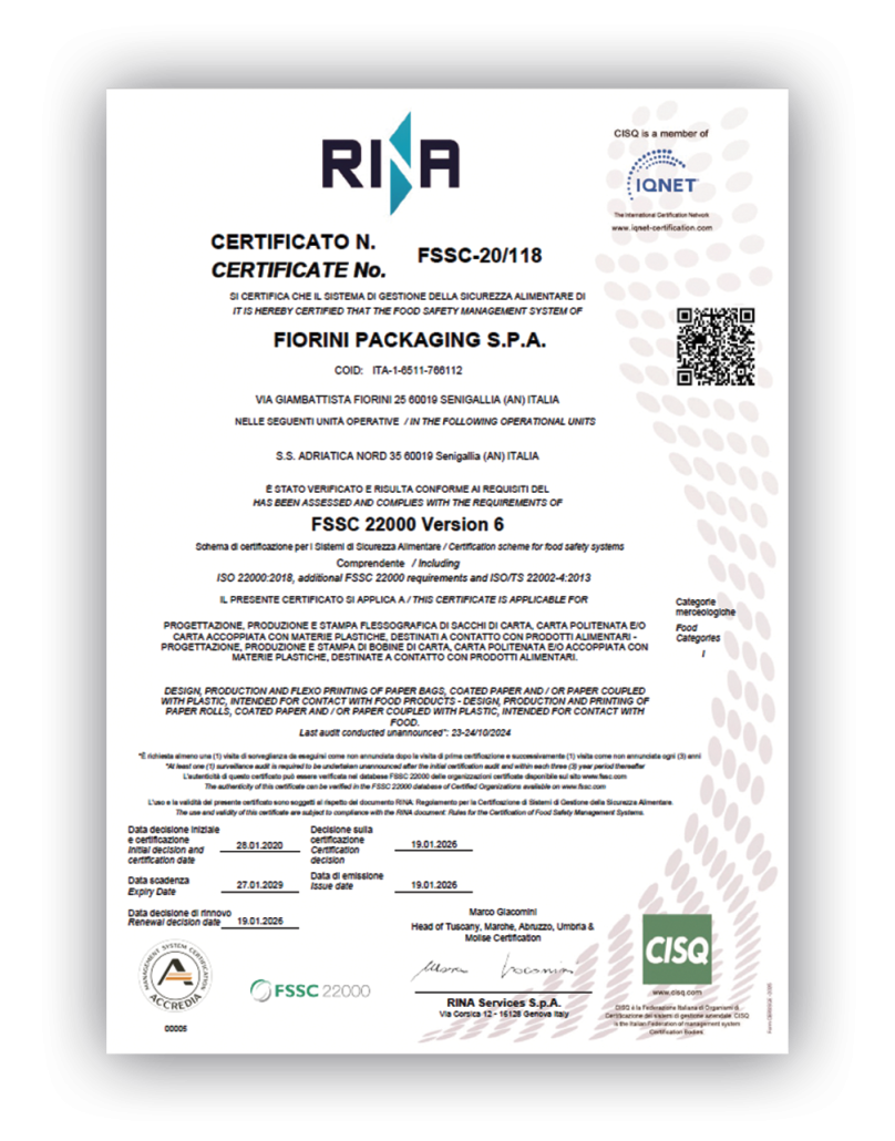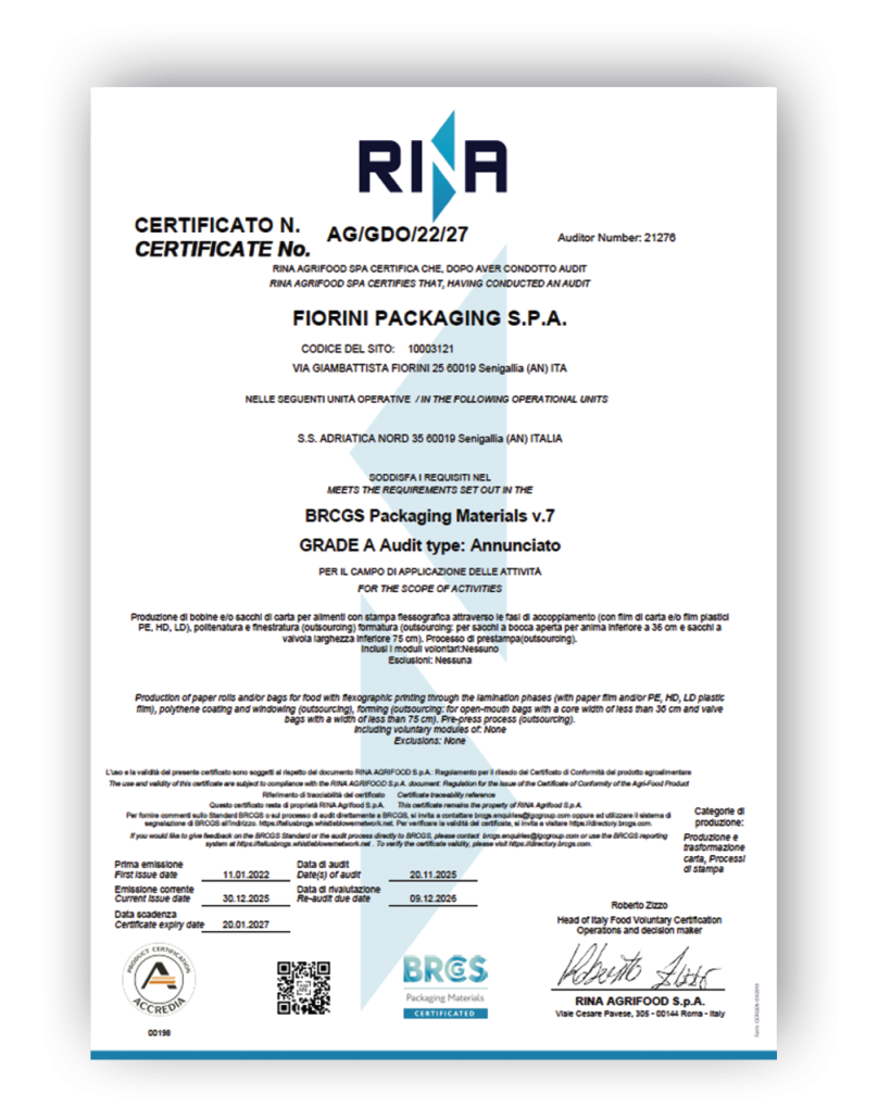 Il packaging diventa parte integrante di queste regole che, in abbinamento con il sistema per la sicurezza alimentare garantito dalle più alte certificazioni riconosciute a livello internazionale già possedute dalla Fiorini, garantisce al consumatore finale la sicurezza di igiene e di conformità dell’imballaggio.