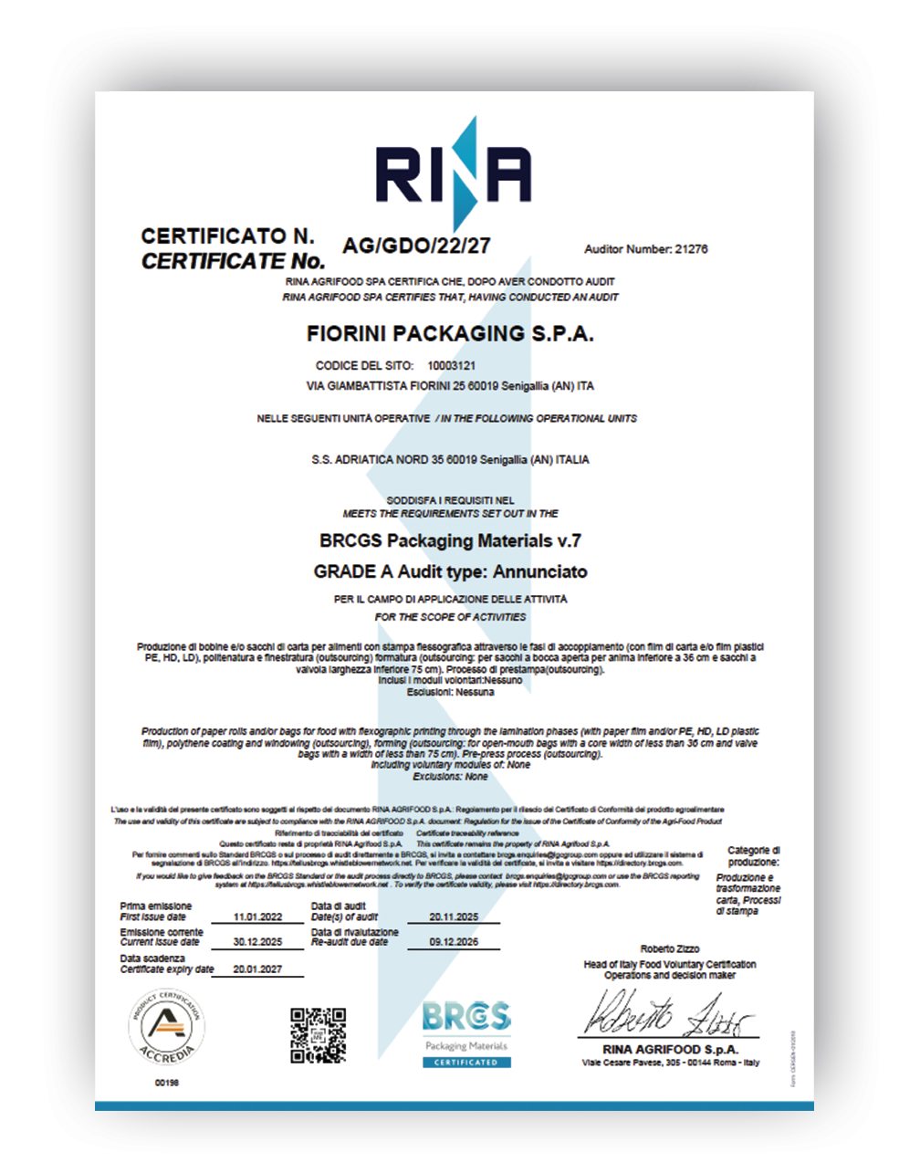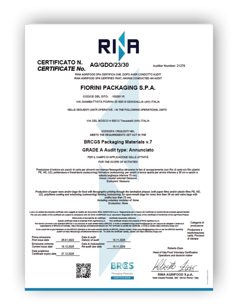 • BRCGS Packaging Materials è una certificazione di prodotto riconosciuta in tutto il mondo come uno degli standard principali in materia di sicurezza alimentare
