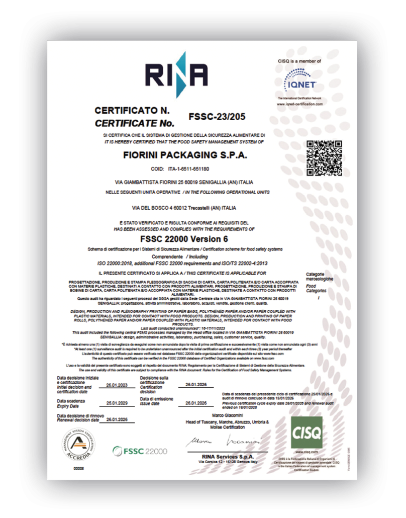 The packaging becomes an integral part of these rules that, in combination with the food safety system guaranteed by the highest internationally recognised certifications already possessed by Fiorini, guarantees the end consumer the safety of hygiene and conformity of the packaging.