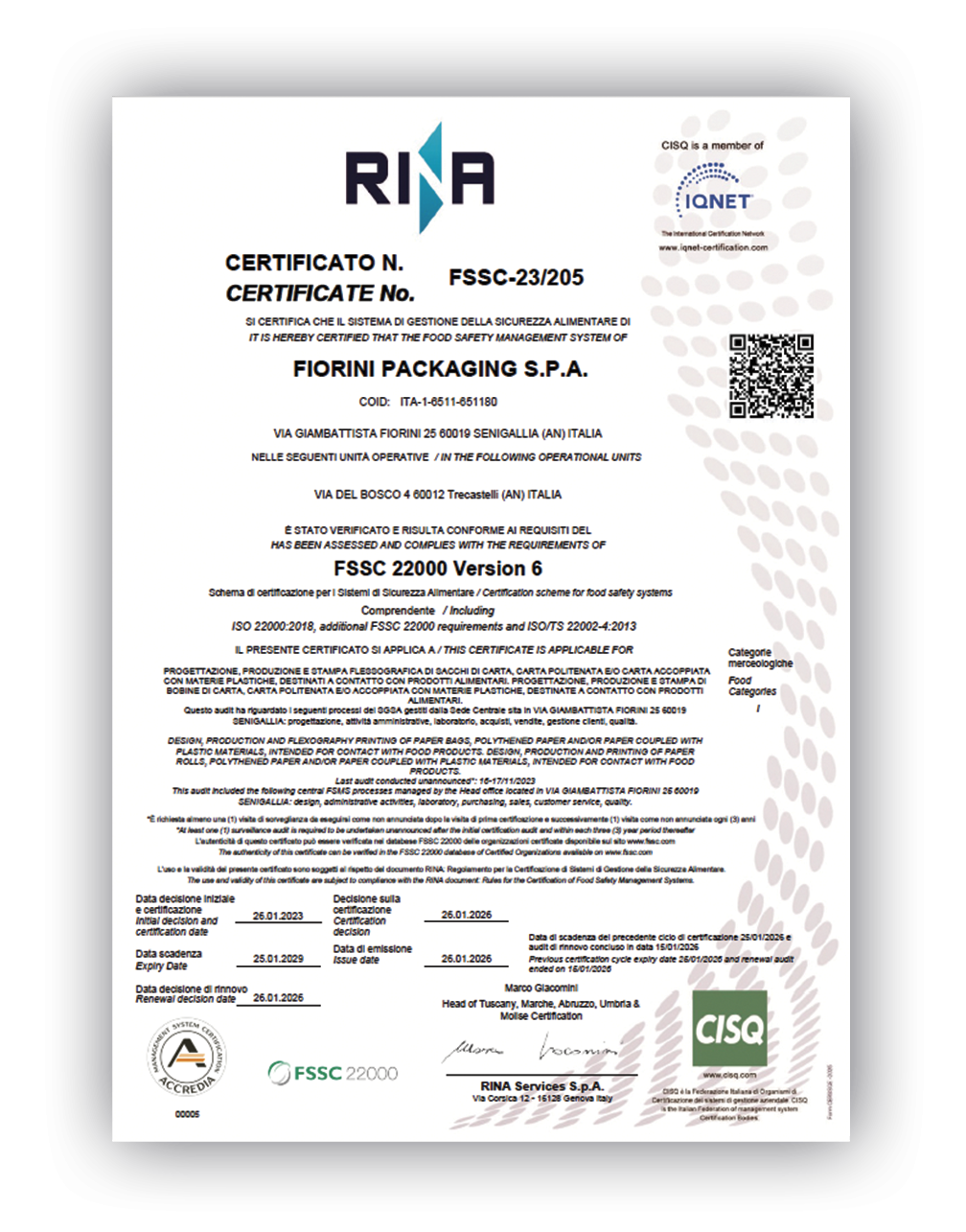• it is a powerful management system which is integrated into the global system at Fiorini Packaging (ISO 9001, ISO 14001, BS OHSAS 18001, ISO 22000, EN 15593)