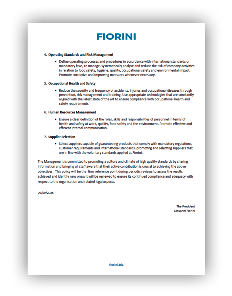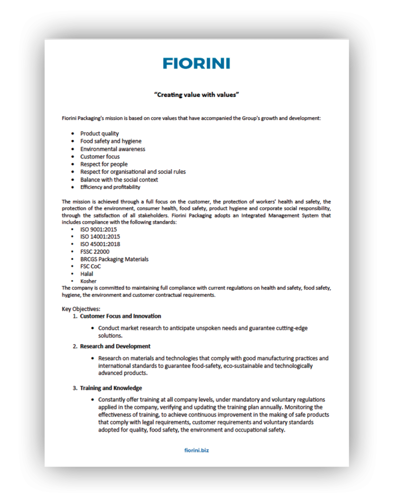 The mission is achieved through a full focus on the customer, the protection of workers’ health and safety, the protection of the environment, consumer health, food safety, product hygiene and corporate social responsibility, through the satisfaction of all stakeholders. Fiorini Packaging adopts an Integrated Management System that includes compliance with the following standards: