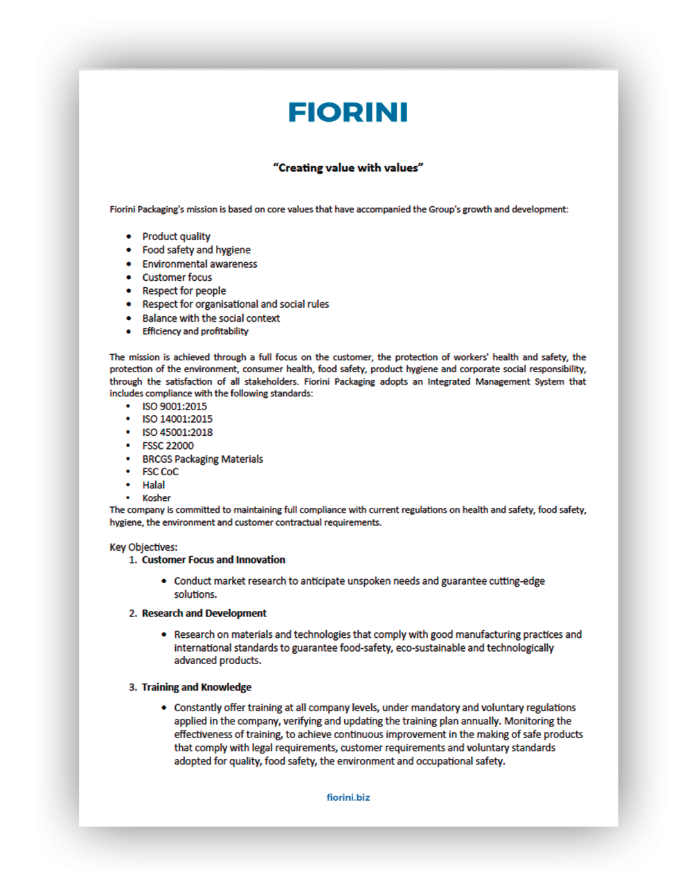 Fiorini Packaging’s mission is based on core values that have accompanied the Group’s growth and development:
