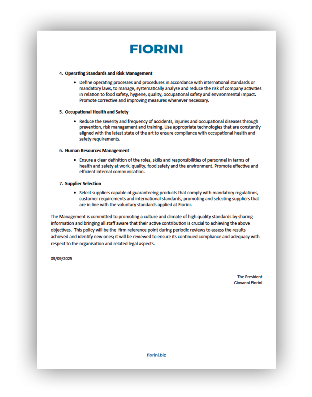 To this end, Fiorini Packaging undertakes to ensure: